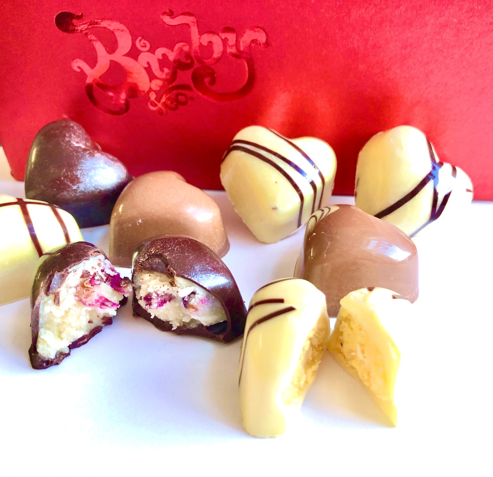 How best does one show love on Valentine’s Day, February 14? Bixby & Co. believes it has the answer. Heart shaped bonbons in exotic flavors and colors packaged in a red boxes with the whitest silk ribbon.