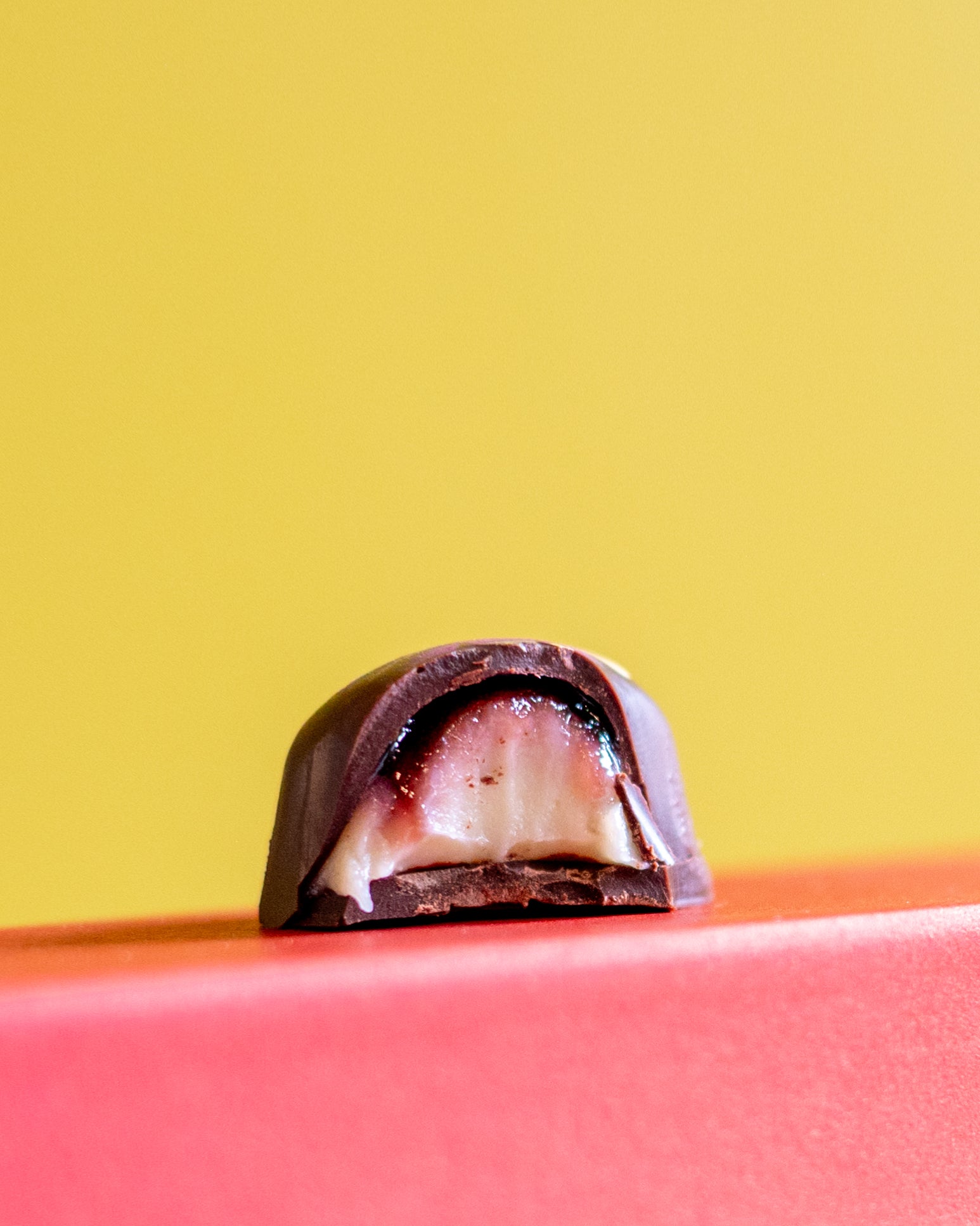Each piece features a dual-layered center: a silky, zesty Yuzu paired with a bright, house-made Raspberry Hibiscus jam. The initial snap of organic dark chocolate gives way to a burst of sunshine, finished with the elegant, tea-like linger of hibiscus.
