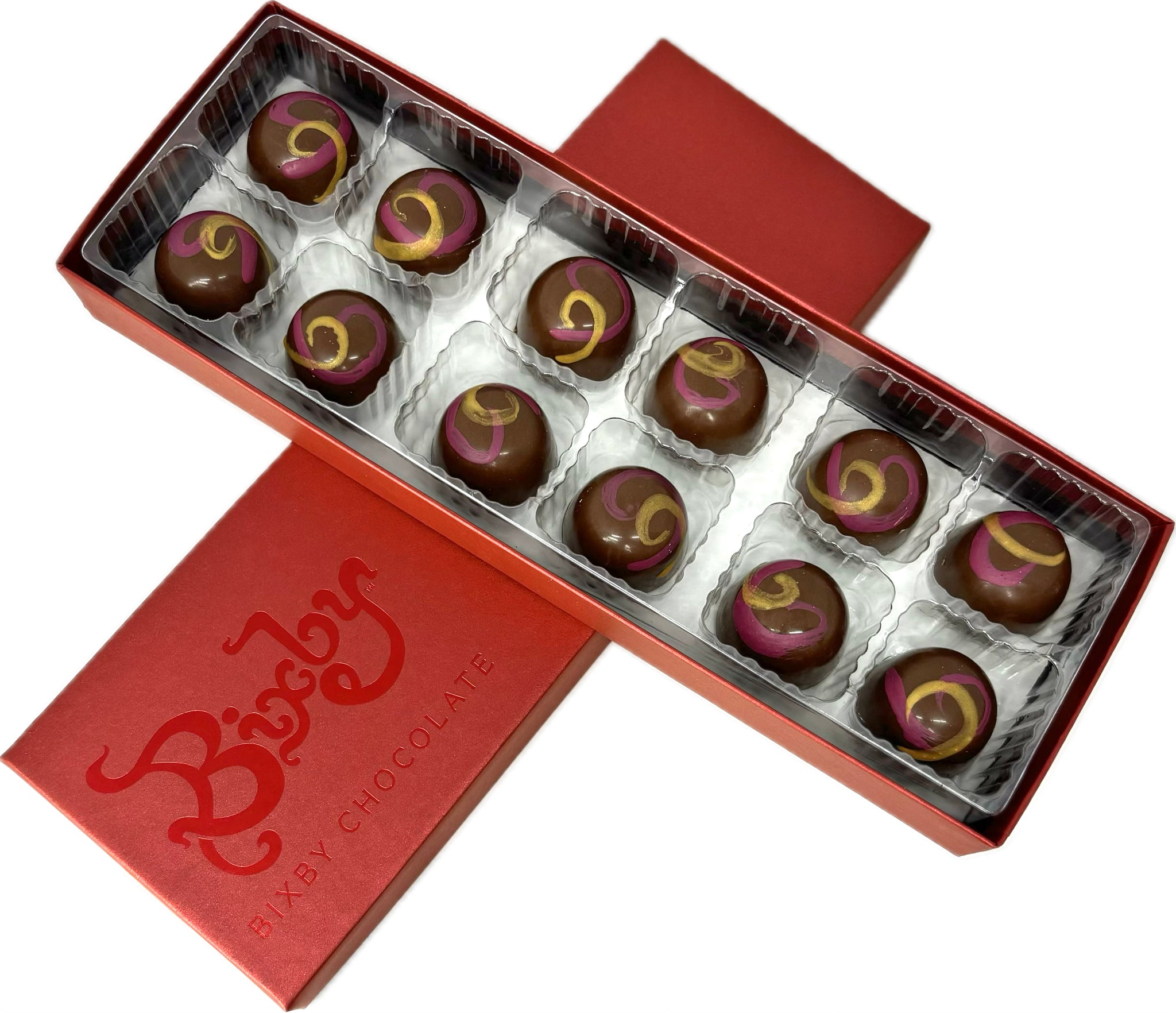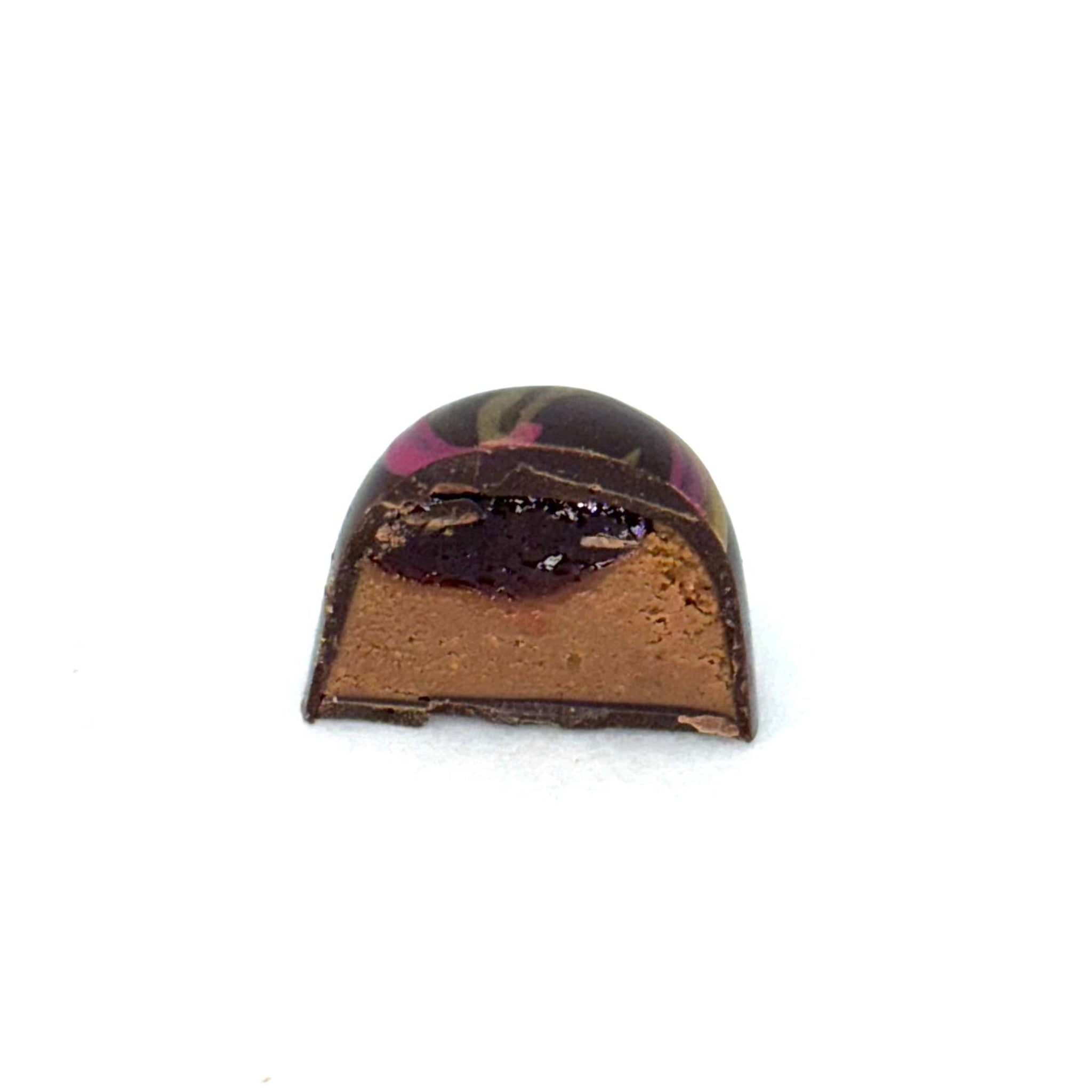 Remember the best part of lunchtime? We took that feeling and wrapped it in chocolate. Our Peanut Butter & Jelly Bonbon layers velvety peanut butter ganache and bright fruit jelly inside a glossy chocolate shell. It's familiar, fun, and just a little bit fancy — everything a great bonbon should be.