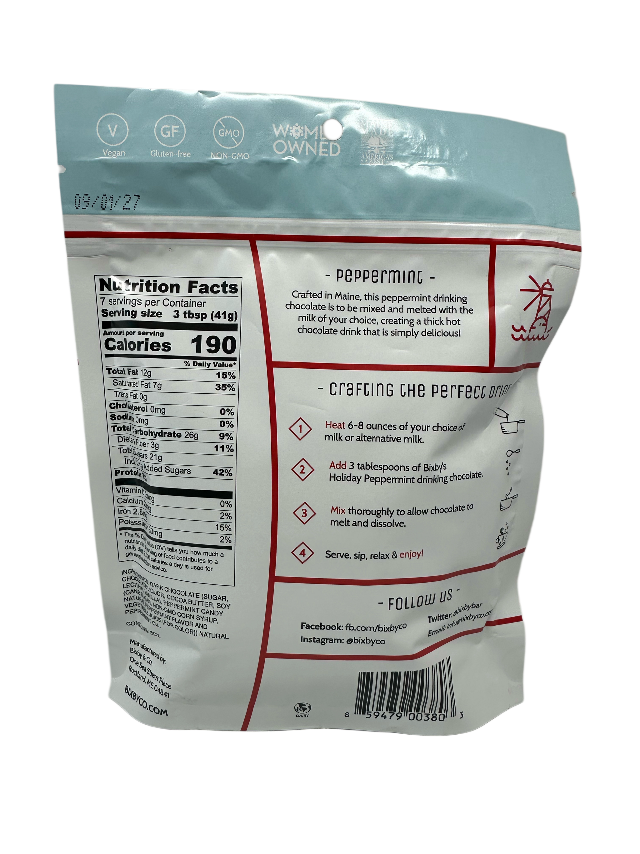 Dark Chocolate (Sugar, Chocolate Liquor, Cocoa Butter, Soy Lecithin, Vanilla), Peppermint Candy (Organic Cane Sugar, Organic Brown Rice Syrup, Natural Peppermint Flavor and Beetroot Juice), Peppermint Oil.